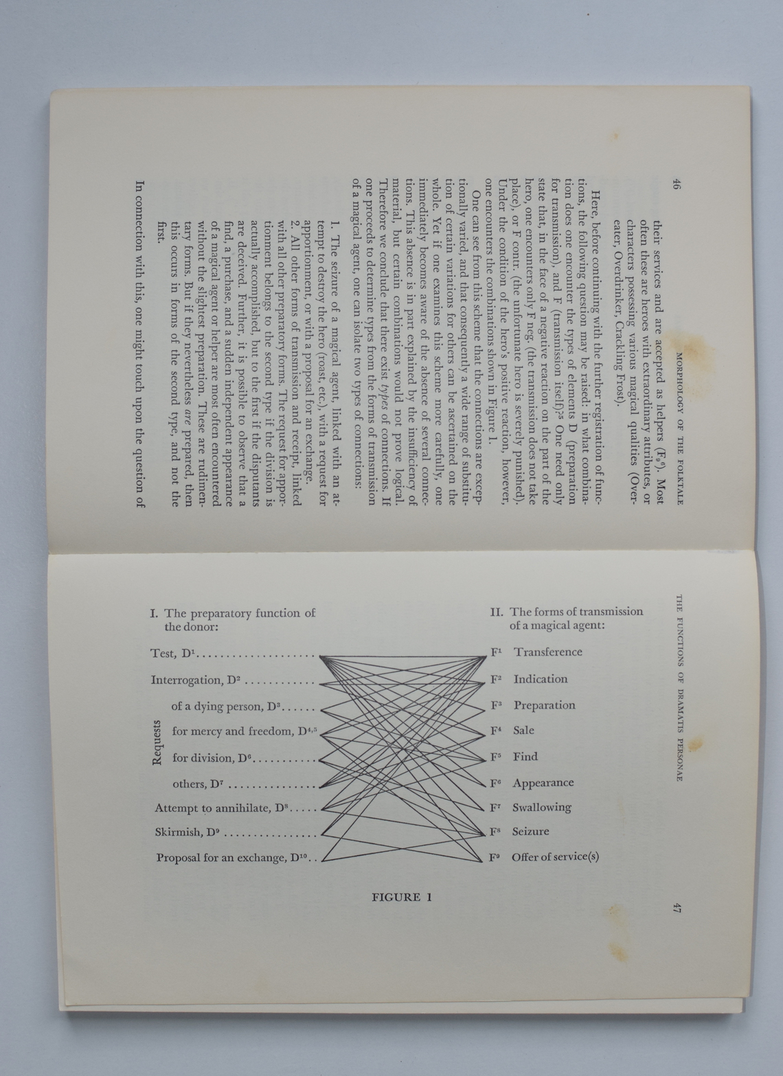 Propp emphasizes that though there are limited narrative functions, the combinatorial possibilities are vast. For example: how a hero receives a magical object. The first column lists possible precursors to the exchange (e.g. a test by the object’s donor, a skirmish with the object’s donor) and the second column lists the actual forms of transmission (e.g. sale, seizure). The chart shows which sub-functions of D (preparatory function of the donor) can lead to corresponding sub-functions of F (forms of transmission of magical agent).  In other words, the chart shows the ways a hero might encounter the owner of a magical object and then acquire it (wrest it away, steal it, earn it…) for himself.